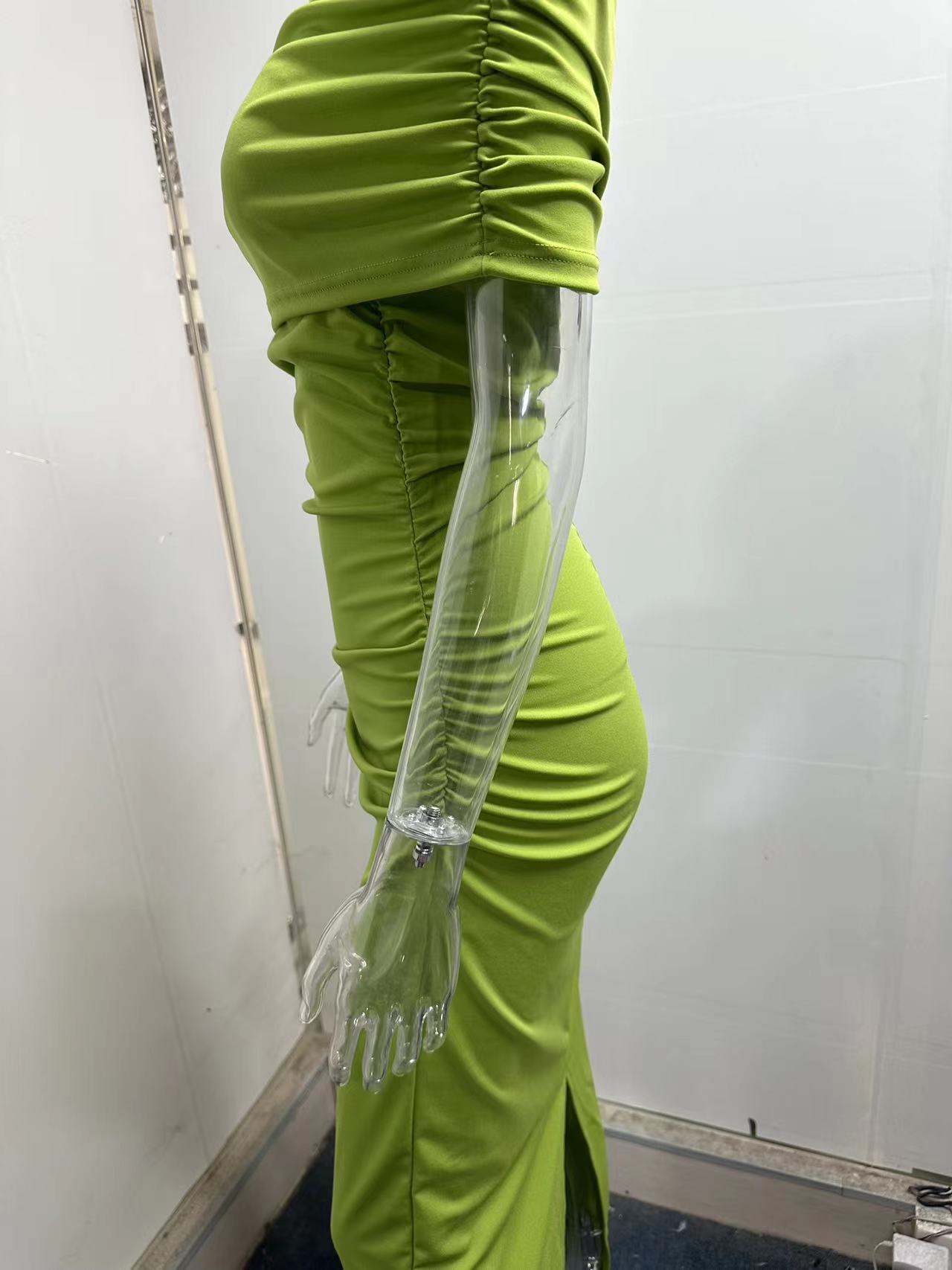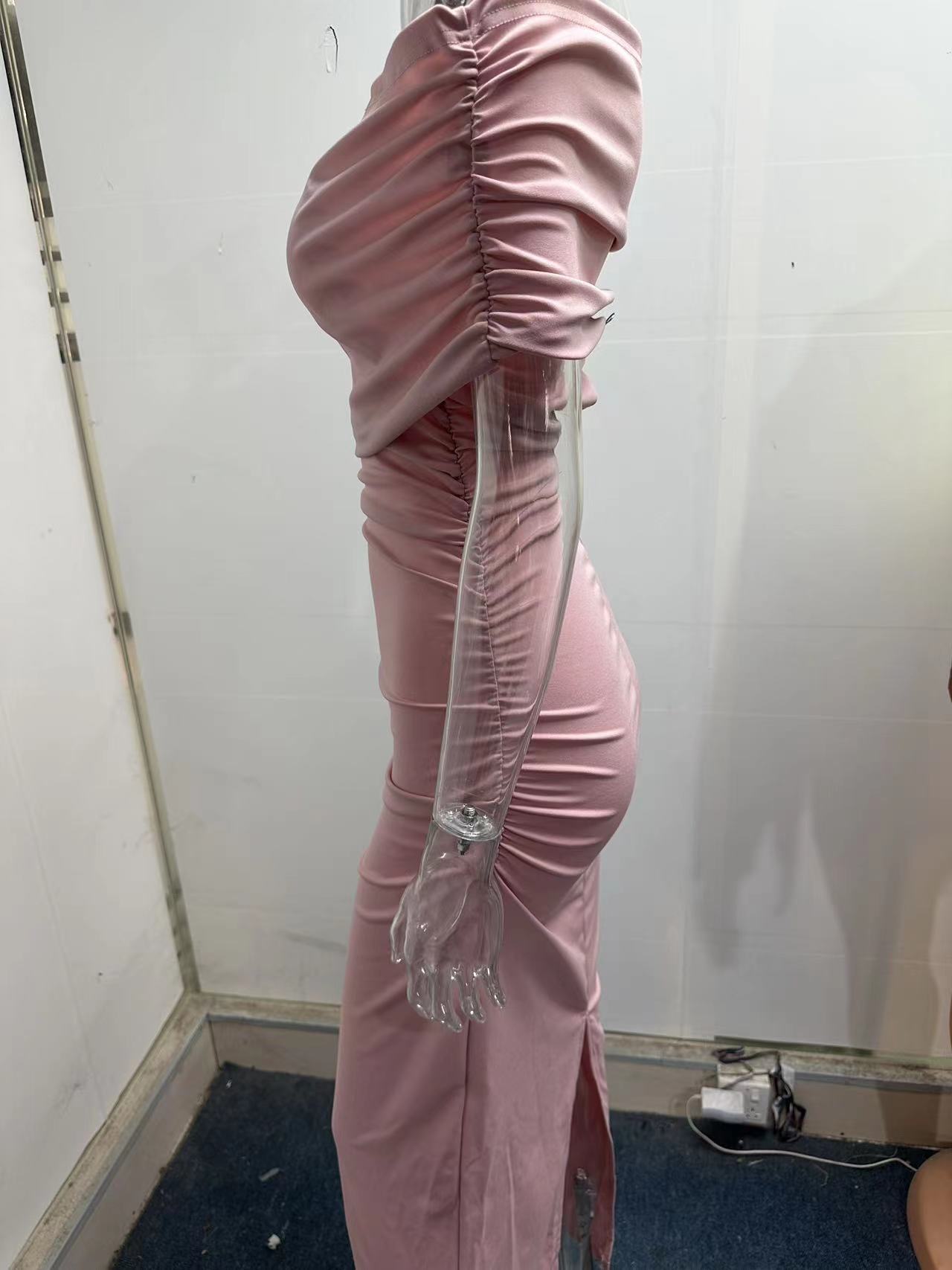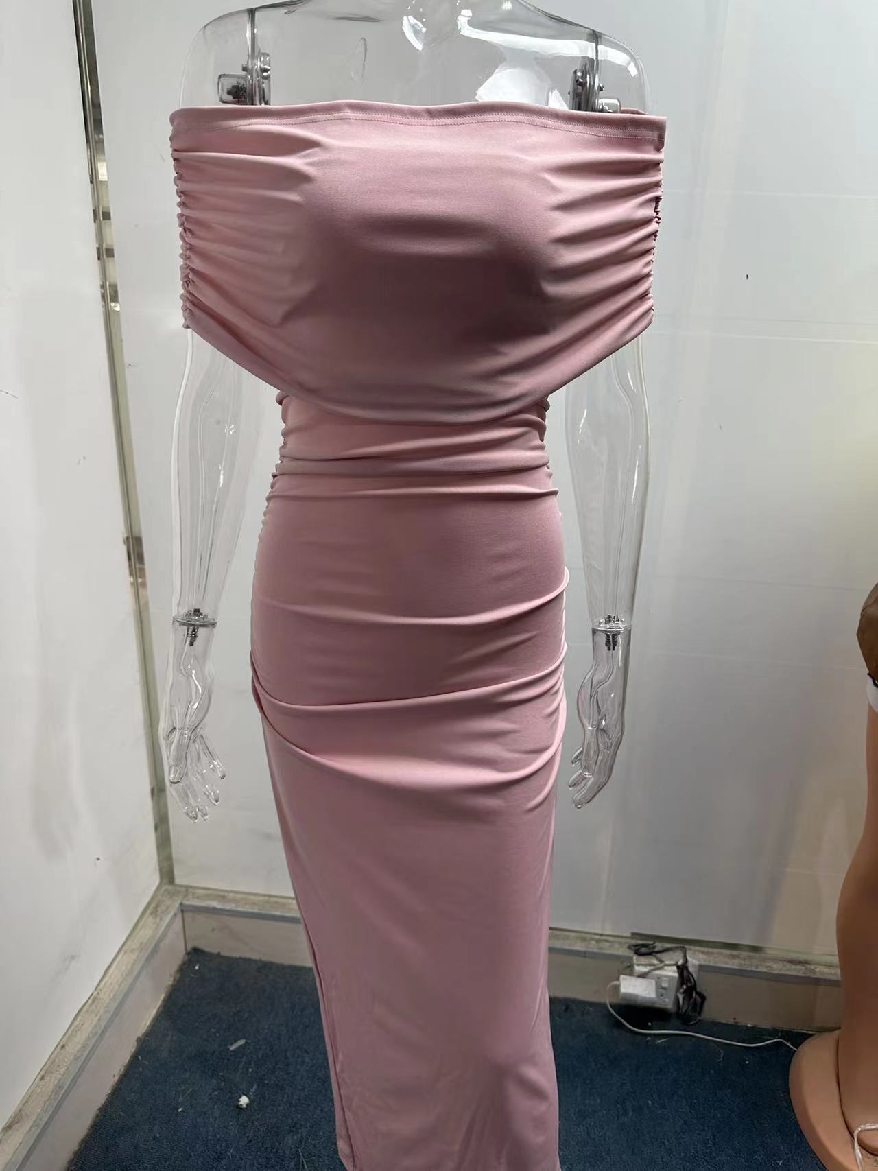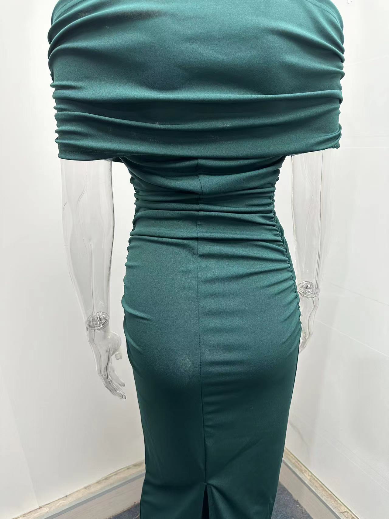 Spring Off Shoulder Pleated Dress Slim Fit Slimming Slit Bottoming Formal Dress